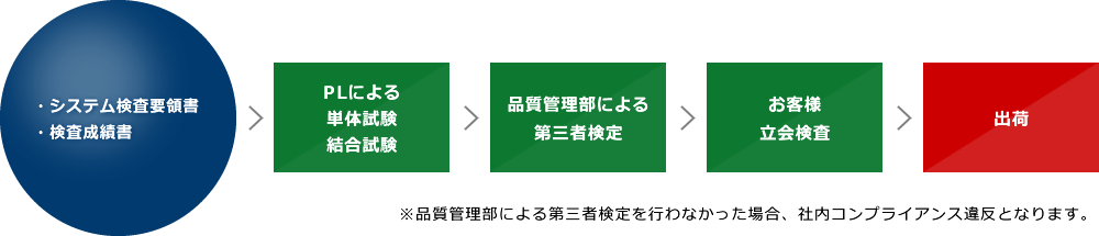 PLのチェック完了後に品質管理部による第三者検定を必ず実施します。この検査に合格するとお客様立会検査が行われ、お客様の承認後に出荷します。